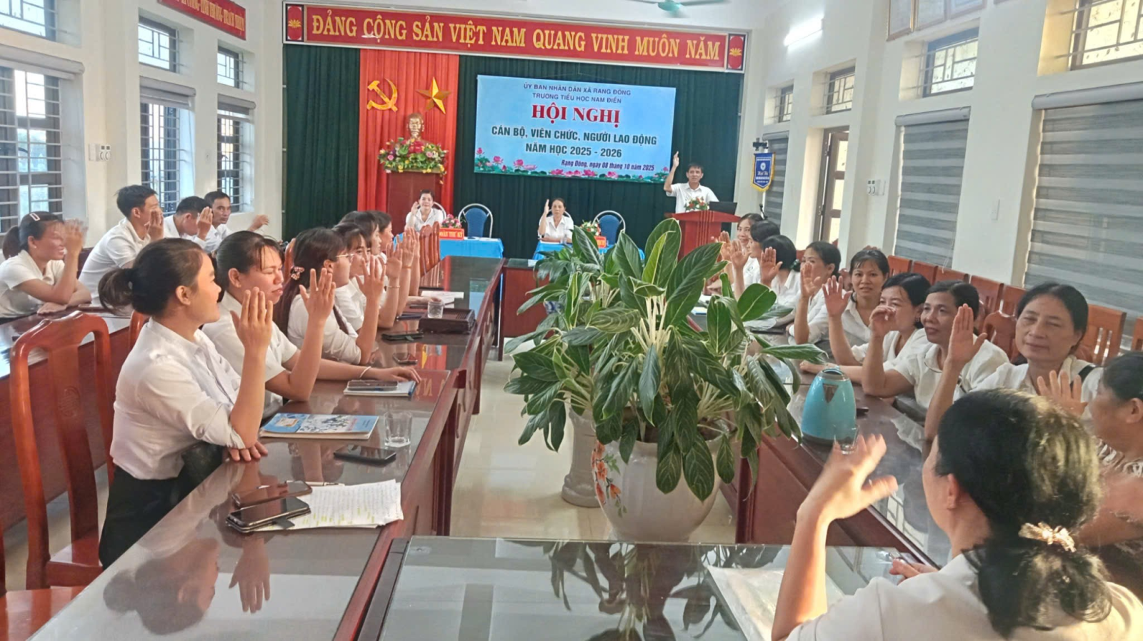 Ảnh: Hội nghị thống nhất cao trong việc phấn đấu hoàn thành xuất sắc các nhiệm vụ năm họcHội nghị năm nay không chỉ là dịp để đánh giá, tổng kết mà còn là minh chứng cho tinh thần đoàn kết, sáng tạo và quyết tâm đổi mới của tập thể nhà trường.Tin rằng với sự chỉ đạo sát sao của Chi bộ, Ban giám hiệu, cùng sự đồng lòng của toàn thể cán bộ, giáo viên, nhân viên – trường Tiểu học Nam Điền sẽ tiếp tục vững bước, hoàn thành xuất sắc nhiệm vụ năm học 2025–2026.